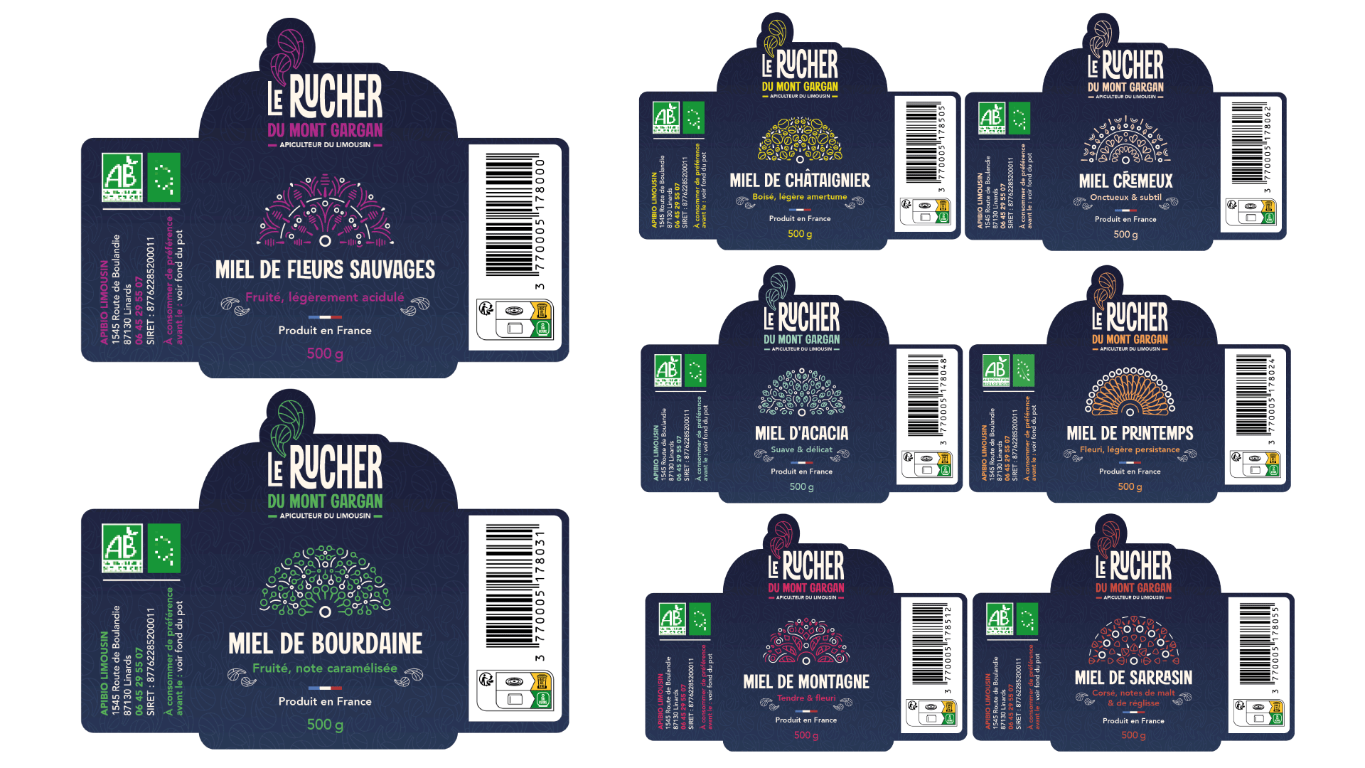 Le motif originel évoque à la fois une aile d’abeille et un pétale de fleur qui, au fil des étiquettes, se décline en motifs abstraits, identifiant chaque type de miel. La couleur est un repère visuel efficace pour les différencier, contrastant fortement sur un arrière-plan sombre. Le nom du produit se détache clairement en blanc dans la police de caractères empruntée à l’identité mère.